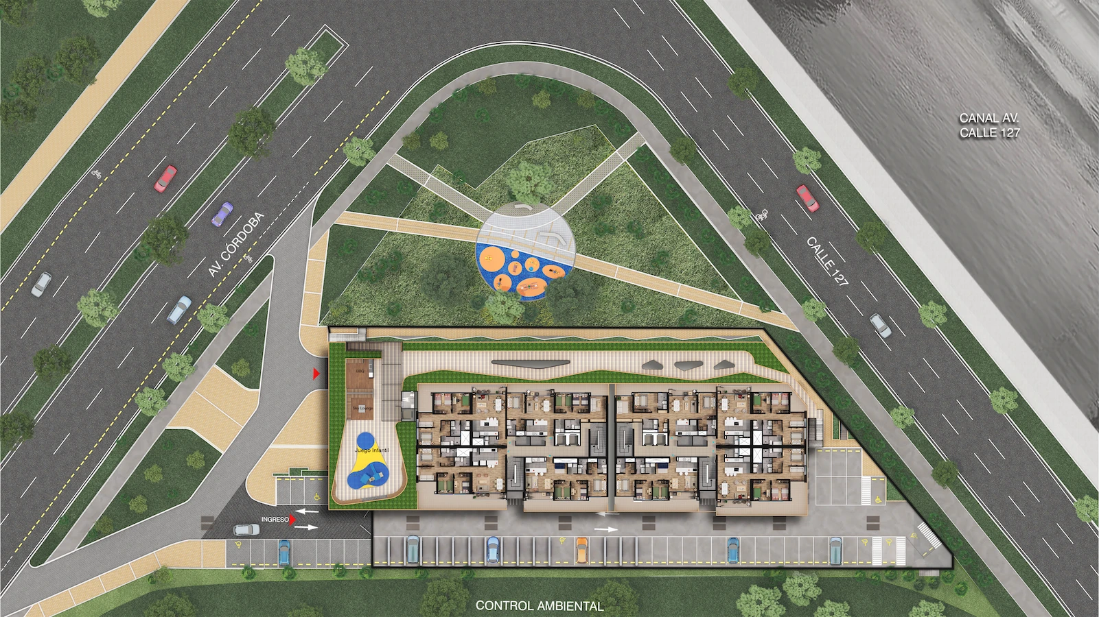 Córdoba 127 tiene 160 apartamentos distribuidos en 2 torres de 21 pisos, de los cuales 20 pisos son de vivienda y un piso no habitable destinado a zonas comunales y a estacionamientos. Cada torre está compuesta por 4 apartamentos por piso con áreas construidas entre los 79 m² y 107 m², con diferentes tipos de distribución interna y con áreas privadas entre 66 m² y 91 m². Cuenta con dos niveles de parqueo semisótano y sótano, 320 parqueaderos destinando 2 cupos para cada vivienda, 53 de visitantes. Del total de parqueaderos 12 son para personas de movilidad reducida. Cada torre se comunica verticalmente por medio de un punto fijo con dos ascensores y dos escaleras de servicio. Las áreas mencionadas son aproximadas, esta sujetas a cambios como consecuencia directa de las modificaciones ordenadas por Curaduría o Alcaldía competente en el trámite para la expedición de la licencia de construcción.