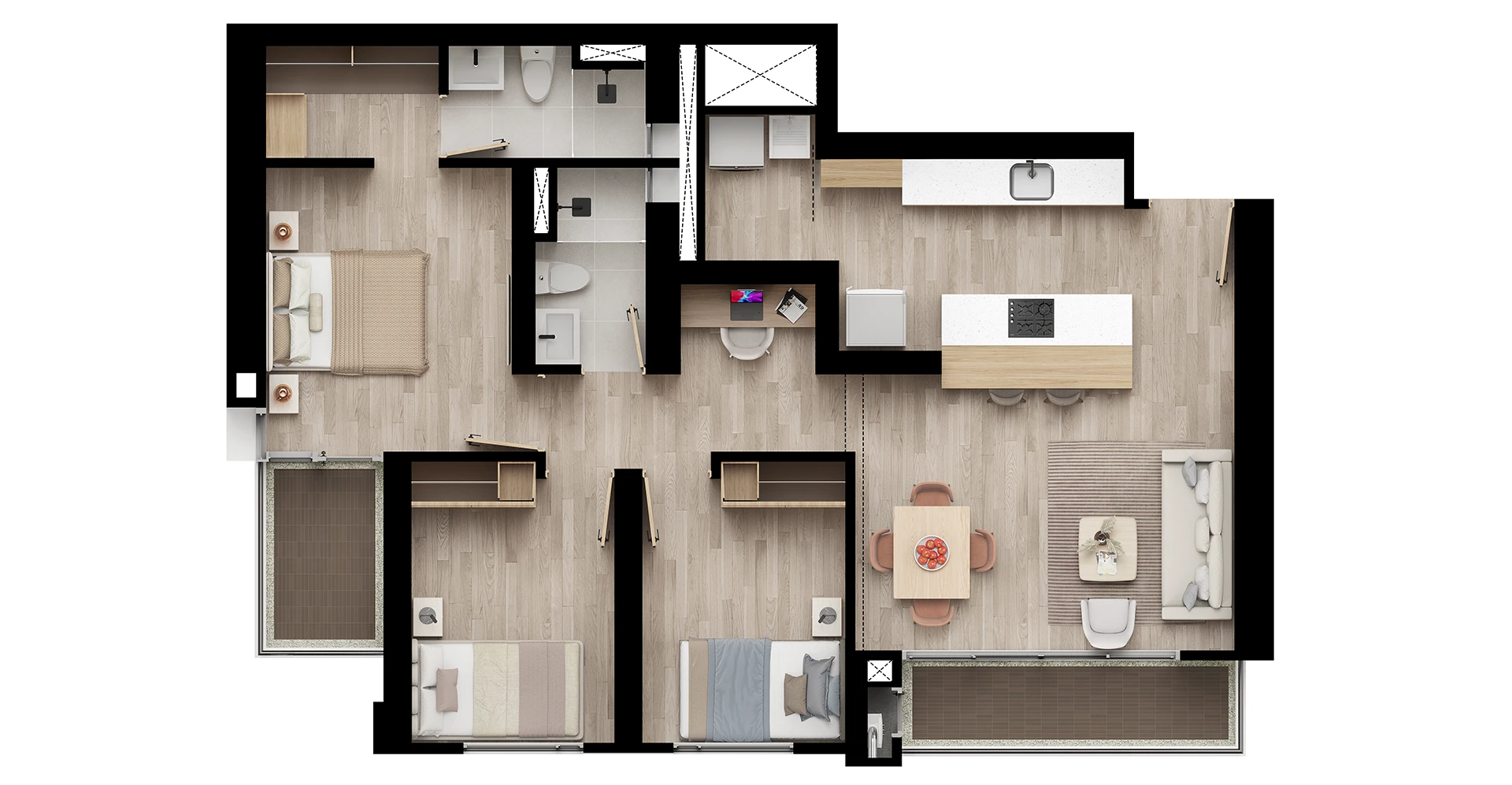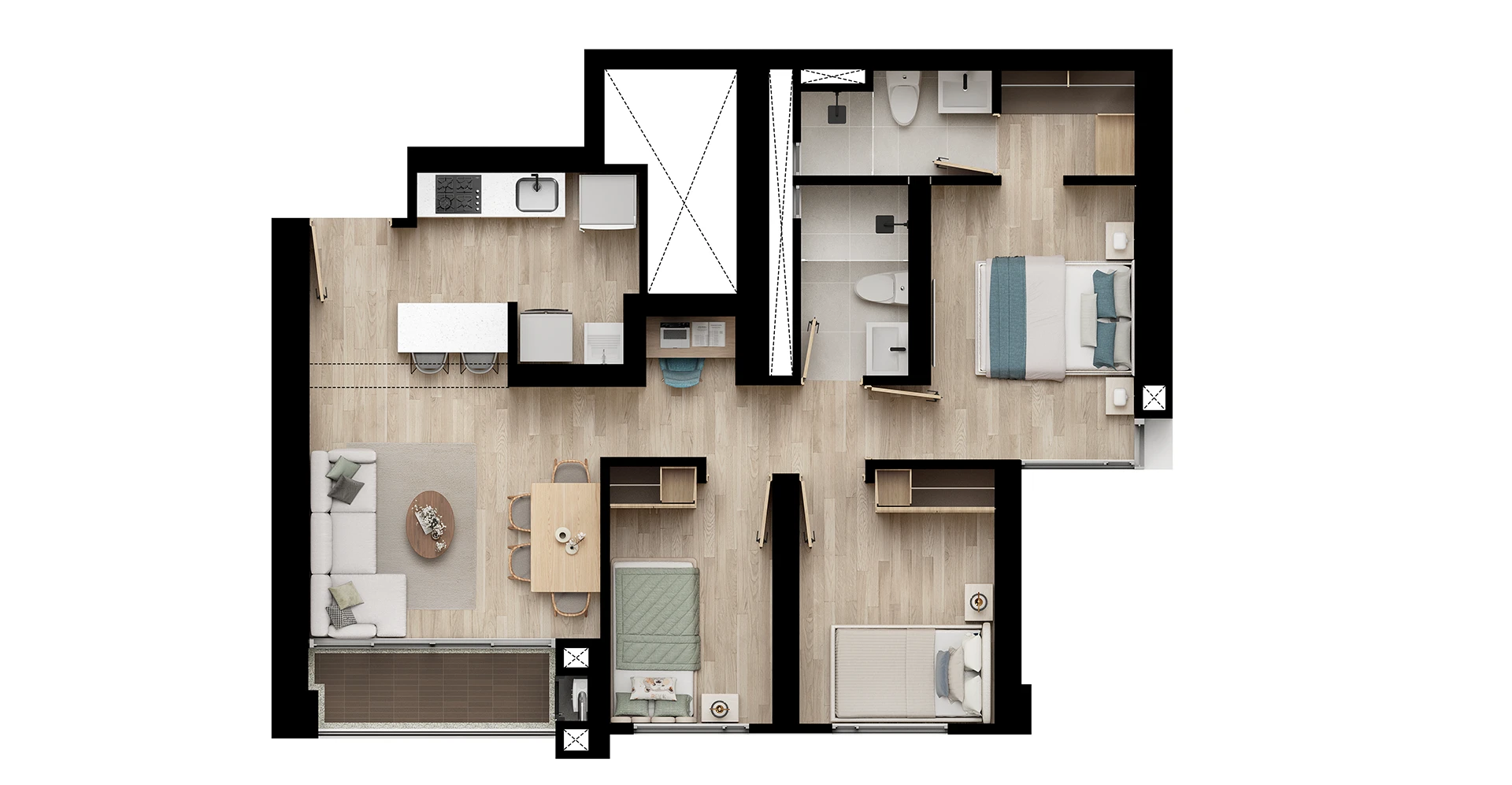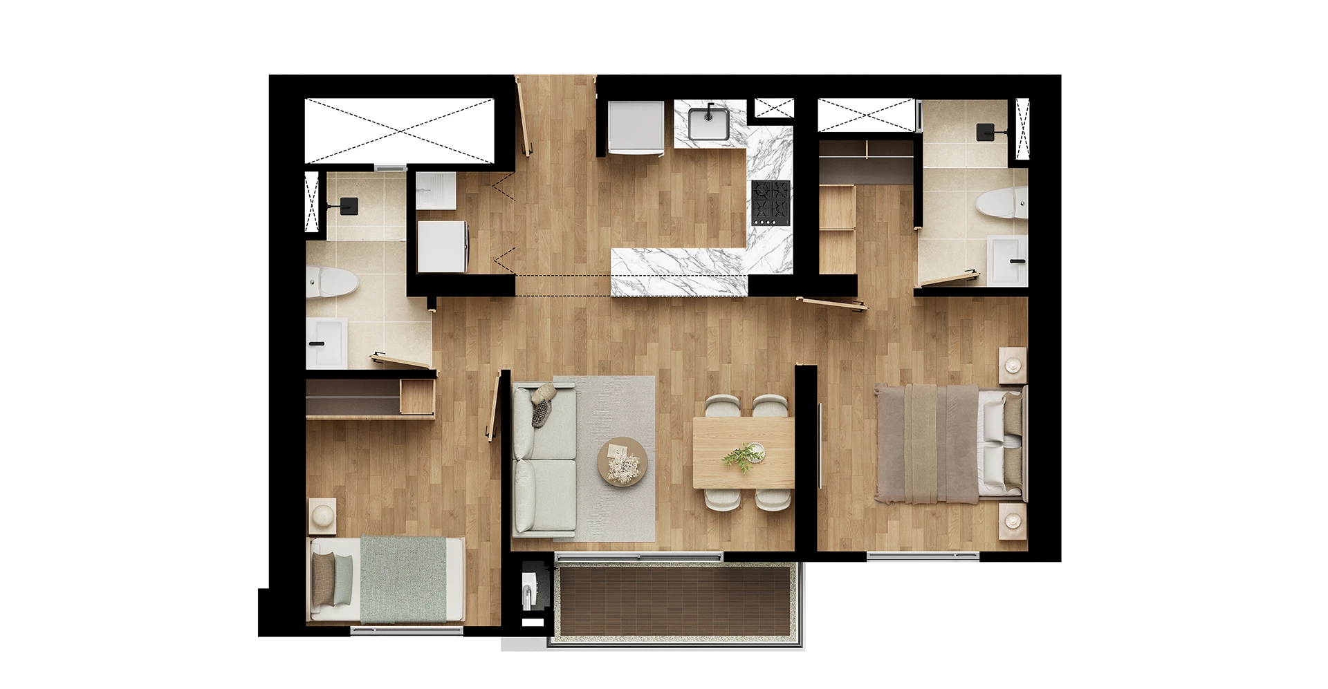 Nota legal: *Las imágenes contenidas en este material son una representación artística del ilustrador, por lo tanto los detalles de diseño, color y especificaciones de materiales están sujetos a modificaciones durante el proceso de construcción. **Los elementos de decoración, dotación, mobiliario y diseño en las imágenes publicadas, así como los planos, vídeos, representaciones 3D, renders y demás piezas publicitarias son una simple representación artística, por lo que su apreciación y construcción final están sujetos a modificaciones sin previo aviso y no constituyen una oferta de entrega de todos los elementos por parte del constructor.