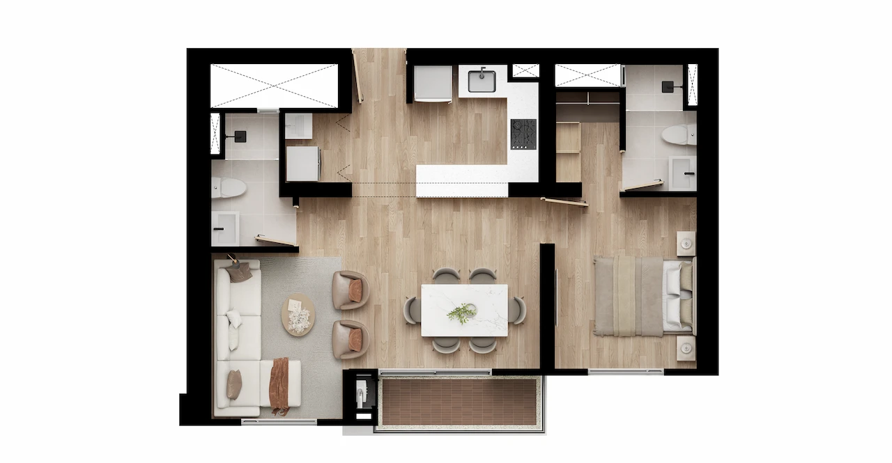 Nota legal: *Las imágenes contenidas en este material son una representación artística del ilustrador, por lo tanto los detalles de diseño, color y especificaciones de materiales están sujetos a modificaciones durante el proceso de construcción. **Los elementos de decoración, dotación, mobiliario y diseño en las imágenes publicadas, así como los planos, vídeos, representaciones 3D, renders y demás piezas publicitarias son una simple representación artística, por lo que su apreciación y construcción final están sujetos a modificaciones sin previo aviso y no constituyen una oferta de entrega de todos los elementos por parte del constructor.