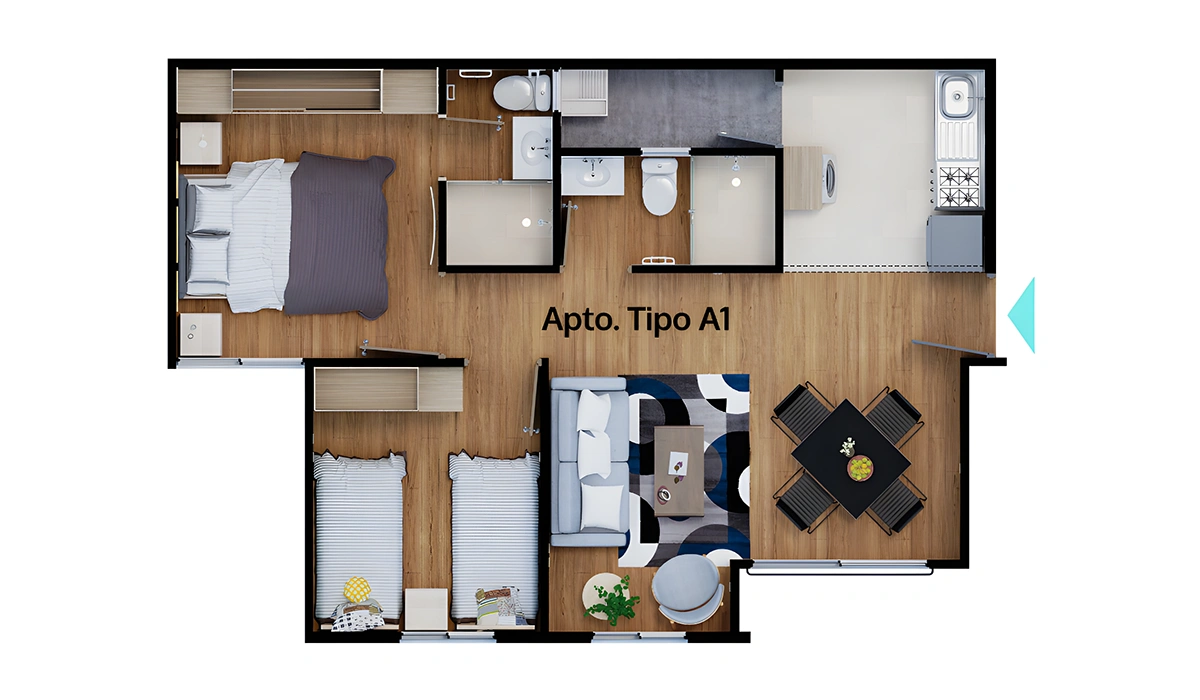 Nota legal: *Las imágenes contenidas en este material son una representación artística del ilustrador, por lo tanto los detalles de diseño, color y especificaciones de materiales están sujetos a modificaciones durante el proceso de construcción. **Los elementos de decoración, dotación, mobiliario y diseño en las imágenes publicadas, así como los planos, vídeos, representaciones 3D, renders y demás piezas publicitarias son una simple representación artística, por lo que su apreciación y construcción final están sujetos a modificaciones sin previo aviso y no constituyen una oferta de entrega de todos los elementos por parte del constructor.